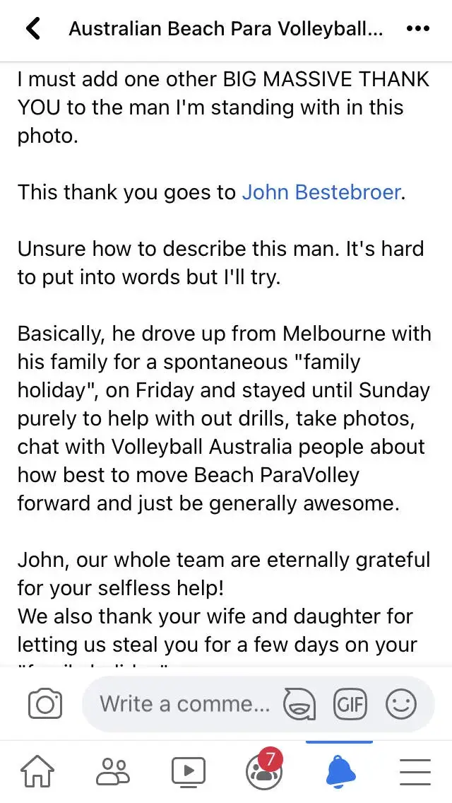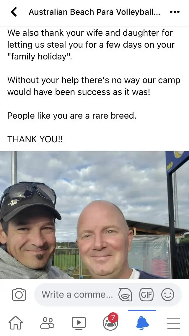 A weekend away with the family to Canberra took an unexpected turn after John attended the first national beach paravolleyball training session. He observed that one of the players was also acting as the trainer, and no support staff were present to assist with ball retrieval or to provide coaching input, limiting the potential for more effective training exercises. Motivated to contribute, John returned on both Saturday and Sunday to offer his experience and time to support the training sessions. The Australian beach paravolleyball players expressed their appreciation for his unexpected involvement and assistance.